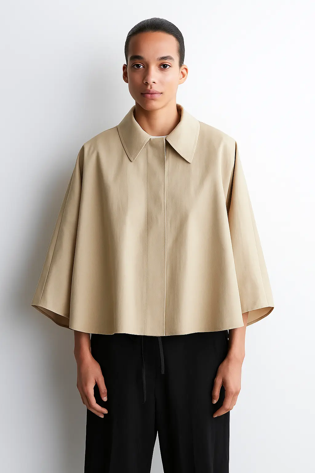 This versatile design artfully merges traits of a vintage overcoat and flowing poncho. It’s made from a soft organic-cotton mix and features a relaxed oversized cut that adapts with sleeve buttons. A hidden closure adds a sleek touch, as the fluid outline offers enduring charm and styl